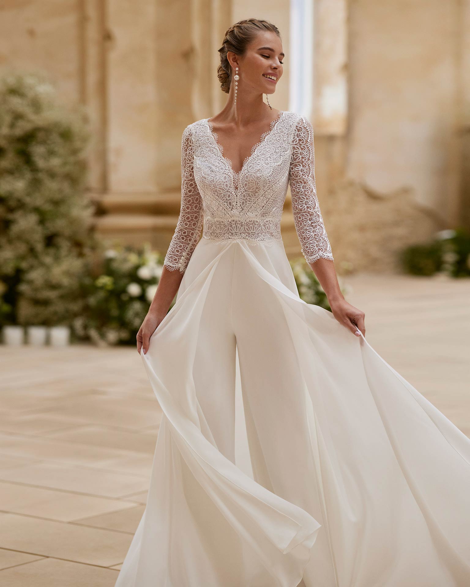 Vestido de noiva longo em estilo sheath/trousers, confeccionado em crespon com detalhes em renda. O modelo apresenta decote em V na frente e nas costas, com mangas três quartos, criando um visual romântico, elegante e delicado. Uma criação Alma Novia que combina charme e sofisticação.