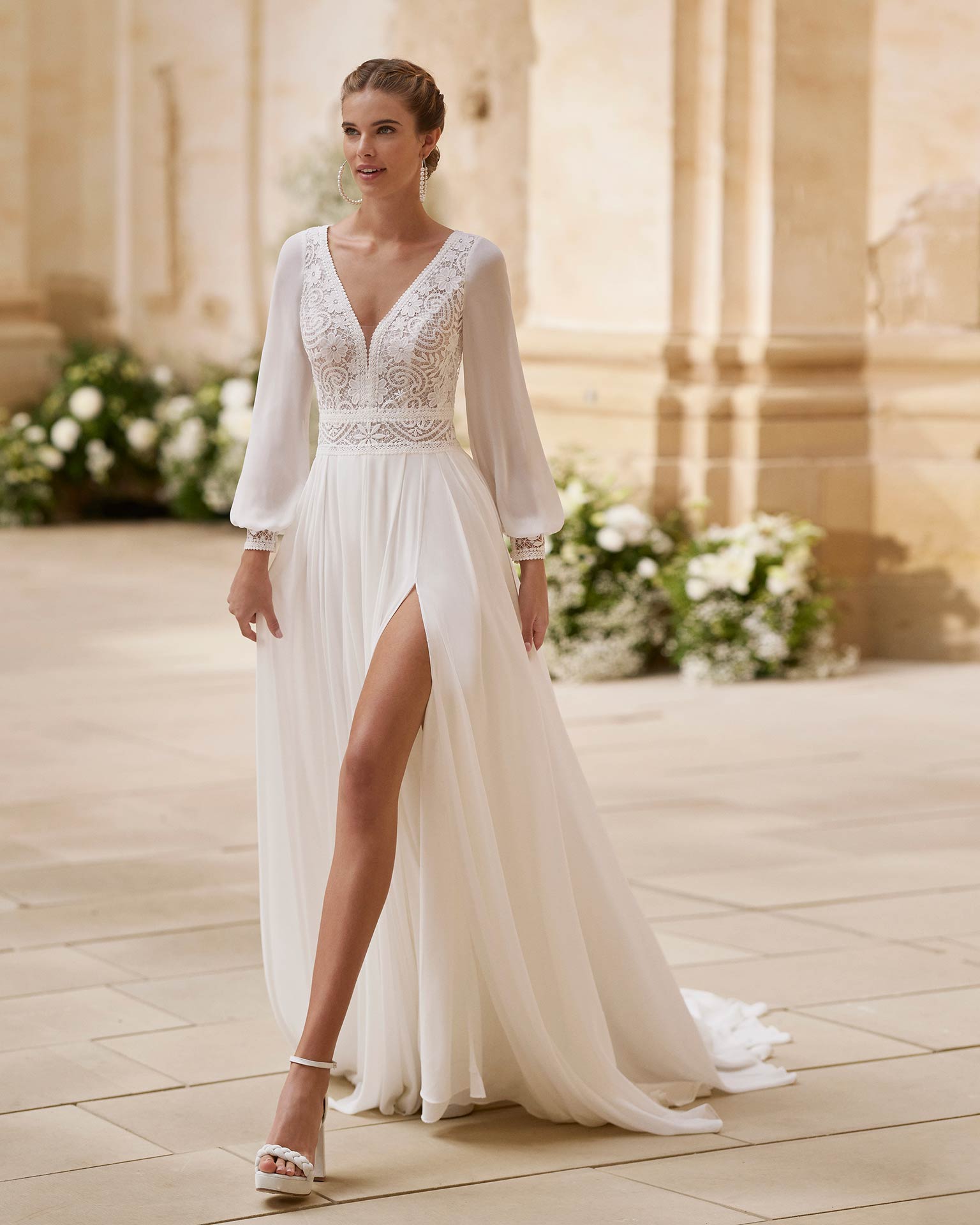 Vestido de noiva boho chic longo em linha A, confeccionado em georgette com detalhes em renda. O modelo apresenta decote em V, abertura em gota nas costas e mangas longas, criando um visual elegante, delicado e com toque boêmio. Uma criação Alma Novia que combina charme e sofisticação.