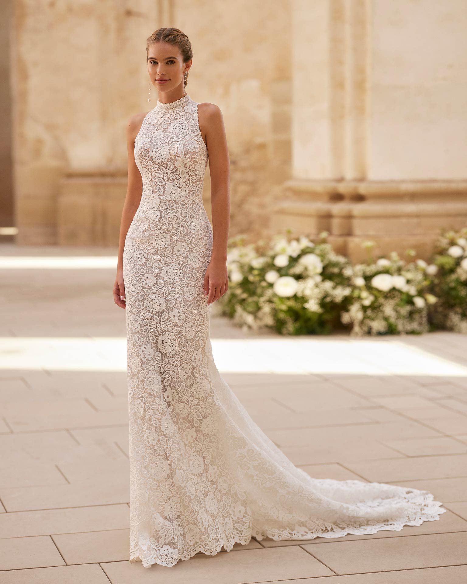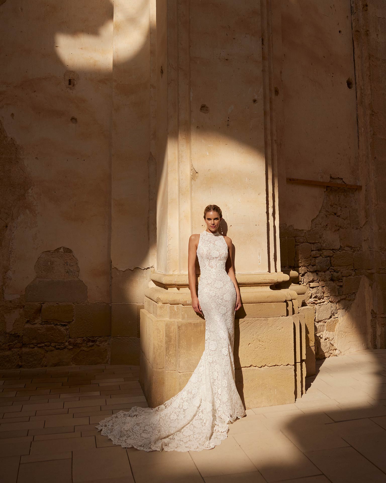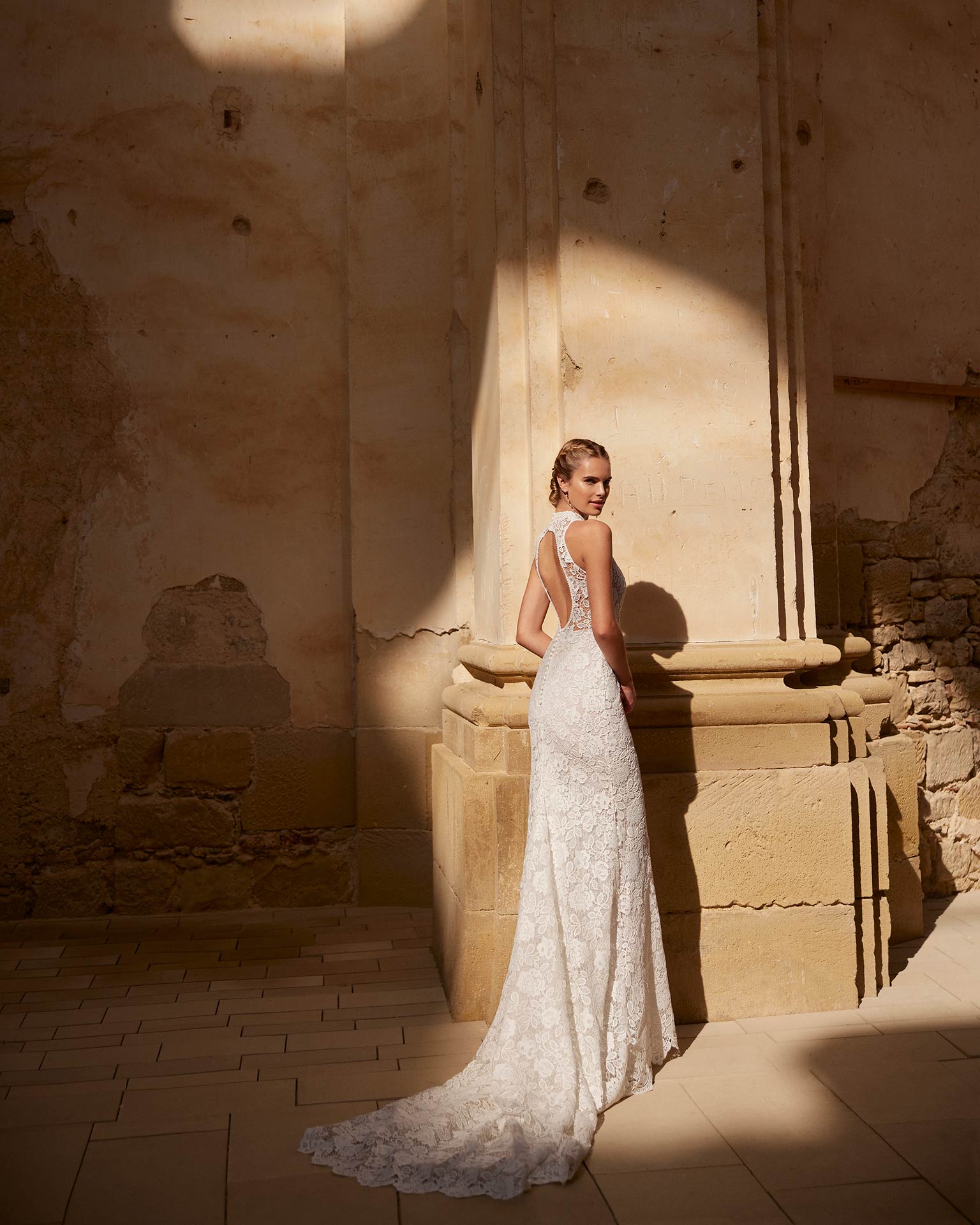 Vestido de noiva estilo Ibiza em modelo sereia, confeccionado em renda guipure. O design traz decote halter e abertura em gota nas costas, criando um visual leve, moderno e sofisticado. Uma criação Alma Novia que combina charme boêmio com elegância.