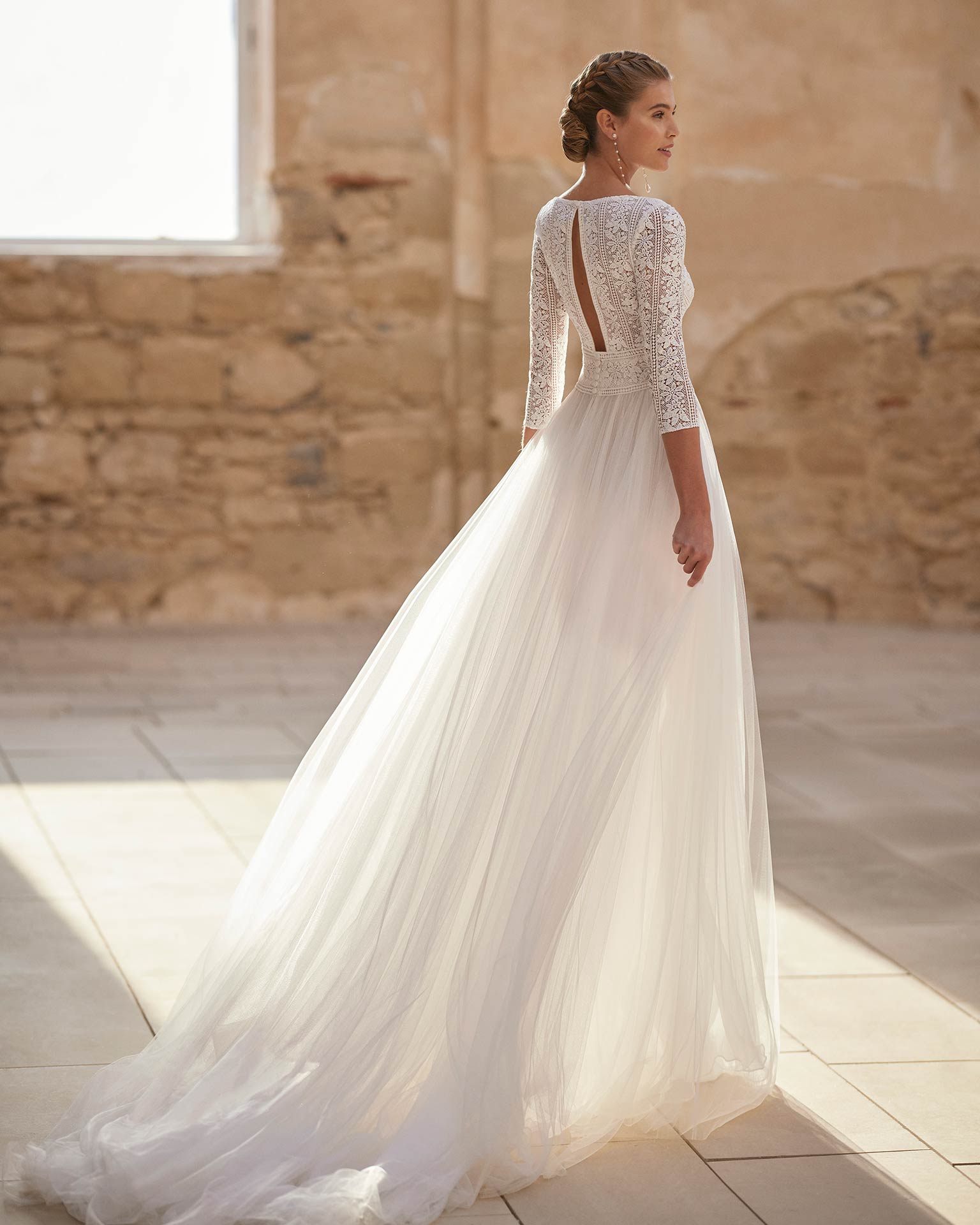Vestido de noiva princesa longo em linha A, confeccionado em tule com detalhes em renda guipure. O modelo apresenta decote redondo, abertura em gota nas costas e mangas curtas, criando um visual delicado e elegante. Uma criação exclusiva Alma Novia que combina charme e sofisticação.