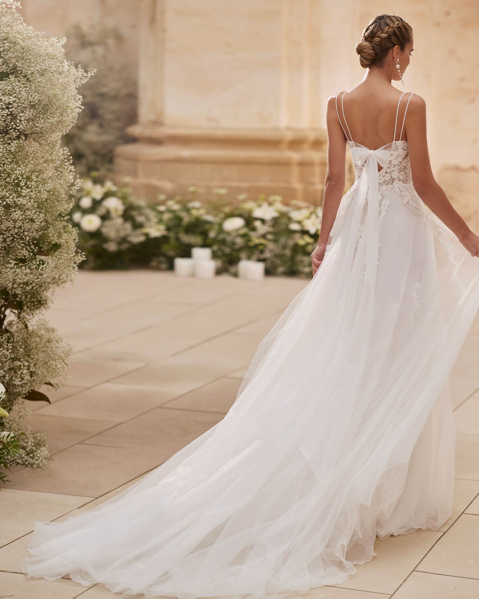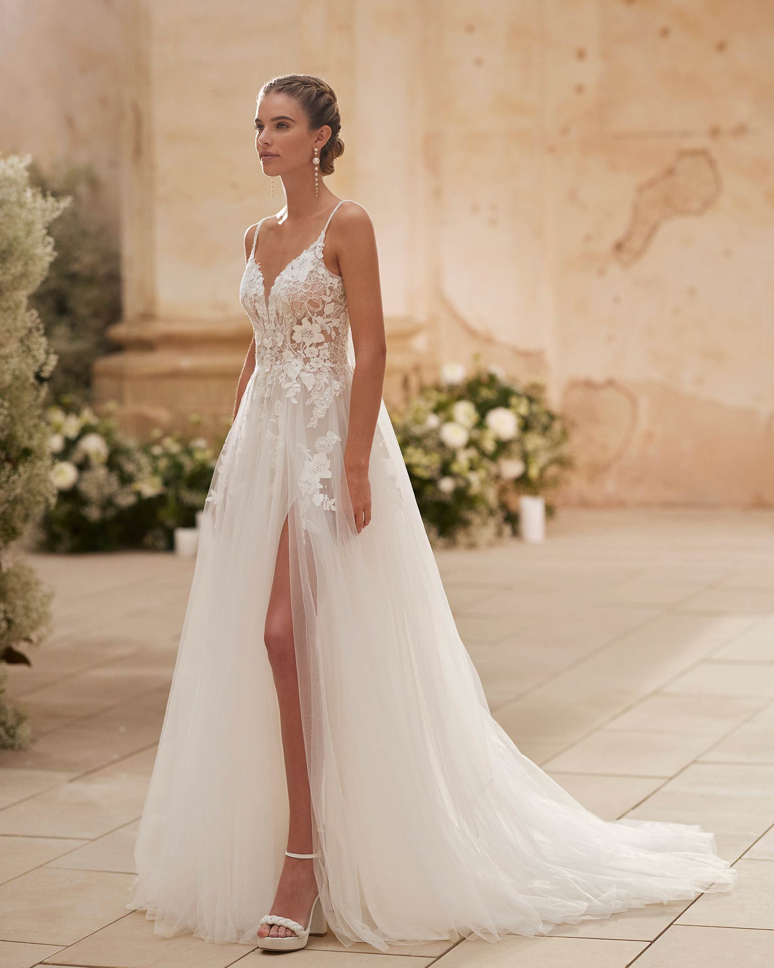 Vestido de noiva princesa longo e romântico, confeccionado em tule com detalhes de renda e pedrarias. O design traz decote em V, laço decorativo nas costas e saia com fenda frontal, resultando em um look delicado e cheio de charme. Uma criação exclusiva Alma Novia que traduz romantismo com elegância.