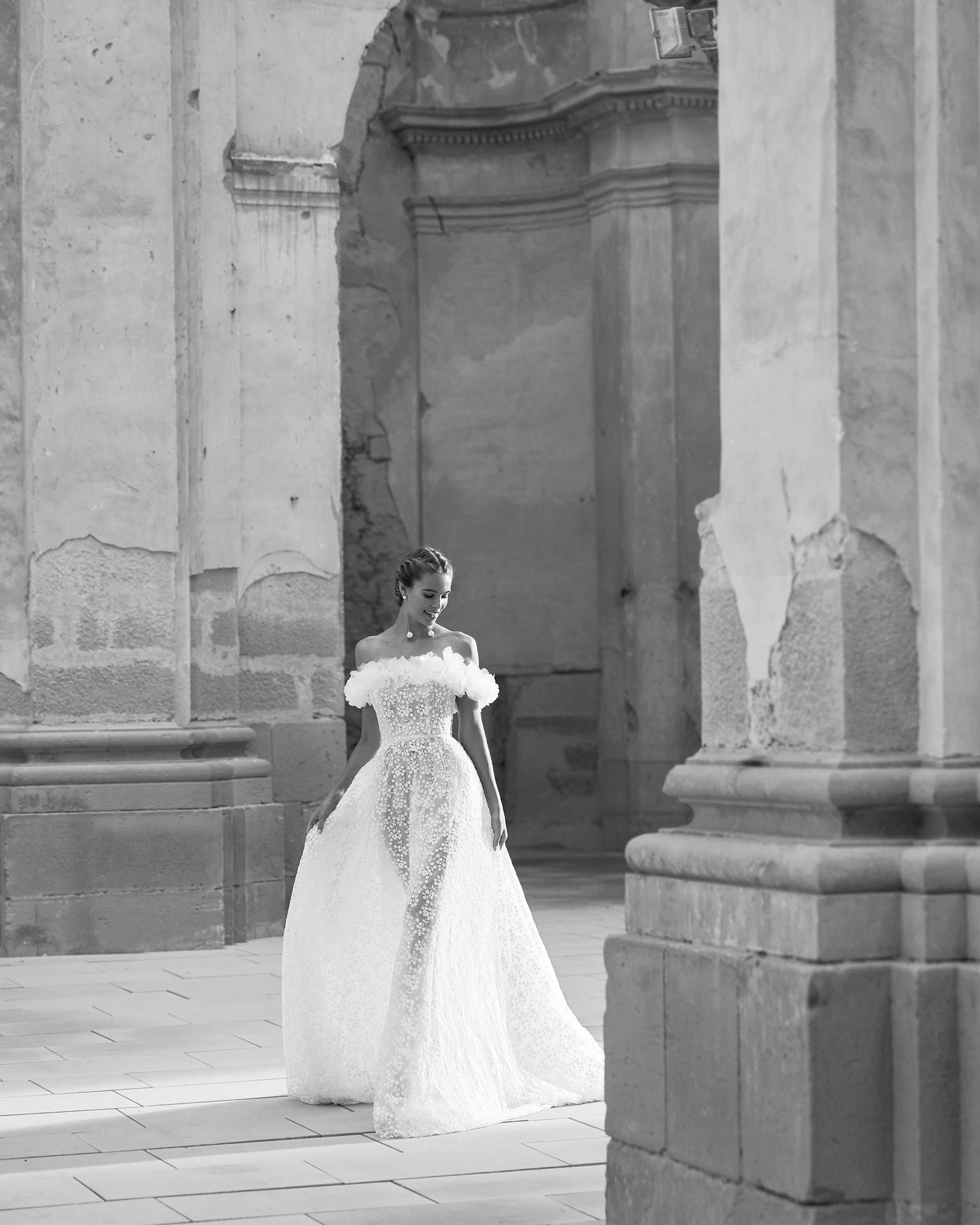Vestido de noiva princesa longo em linha A, confeccionado em renda. O modelo apresenta decote ombro a ombro e mangas drapeadas, criando um visual romântico, elegante e delicado. Uma criação Alma Novia que combina charme e sofisticação.