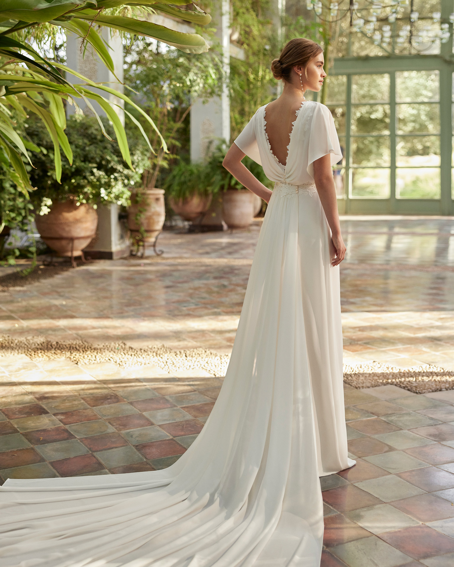 Macacão de noiva em crepe, com cauda removível. O modelo apresenta decote barco, costas abertas e mangas tipo capa. Conta ainda com bolsos práticos e a sofisticação da cauda destacável. Um look Alma Novia cheio de elegância.