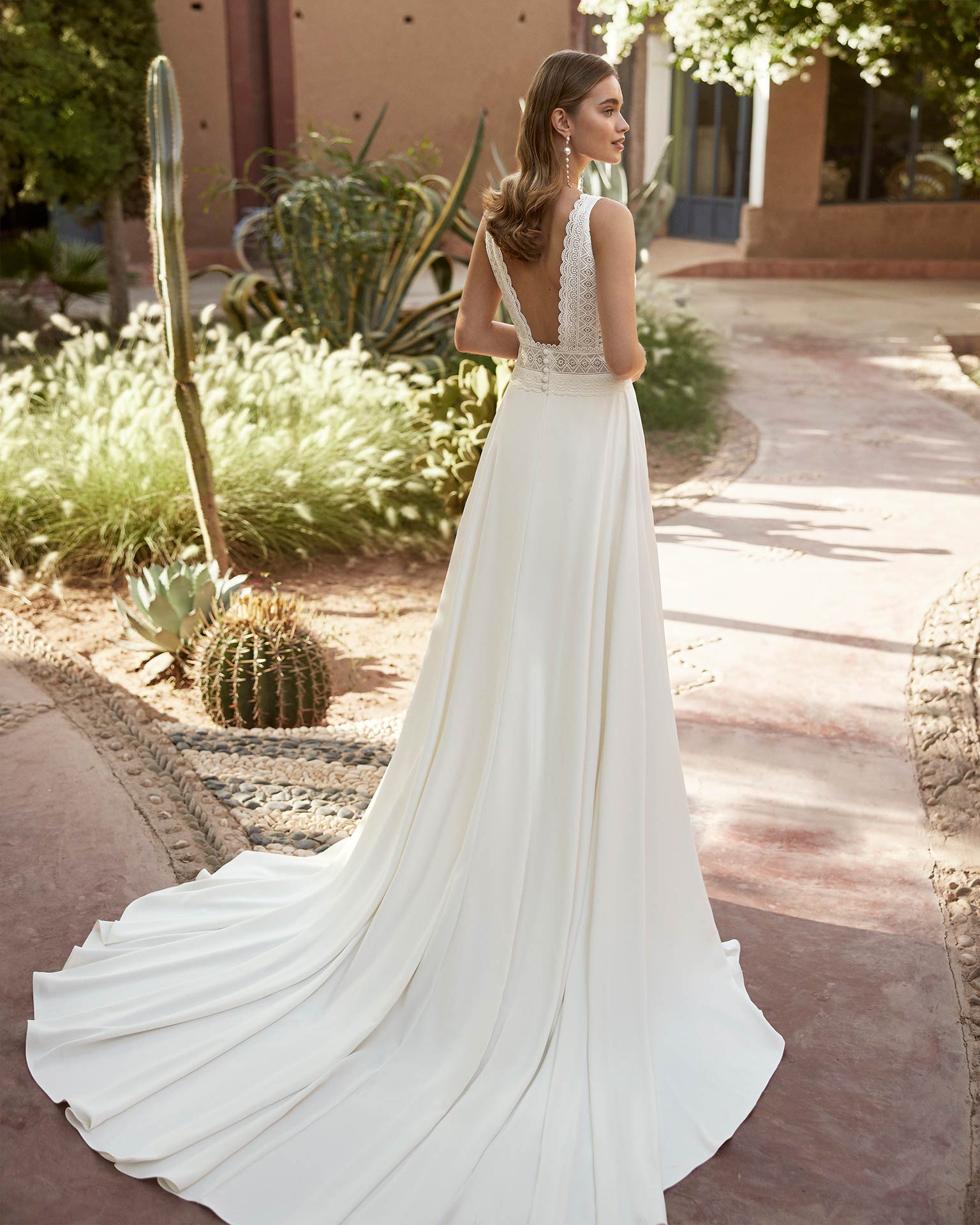 Vestido de noiva princesa em linha A, com corpete em renda guipure e saia em crêpe. O modelo apresenta decote profundo e costas abertas, criando um visual romântico, elegante e sofisticado. Uma criação Alma Novia que combina charme e delicadeza.