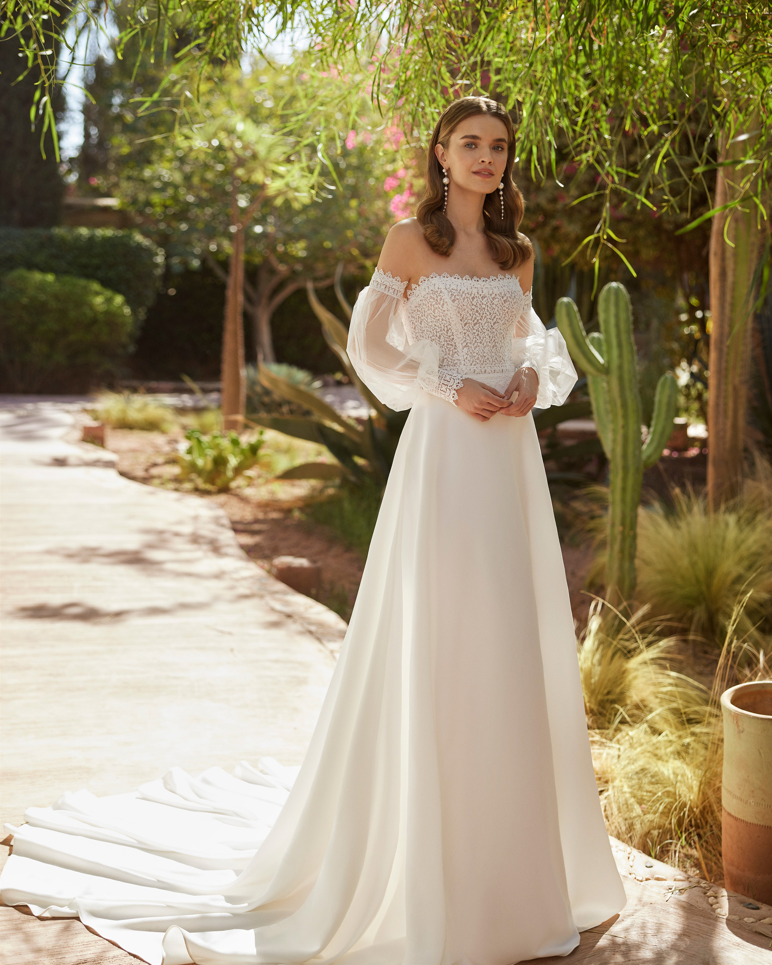 Vestido de noiva em linha A, com corpete em guipure e saia em crepe. Apresenta decote tomara que caia, costas adornadas com botões de pérola e mangas removíveis em tule, permitindo diferentes estilos ao longo do dia. Um conjunto Alma Novia de sonho, elegante e delicado.