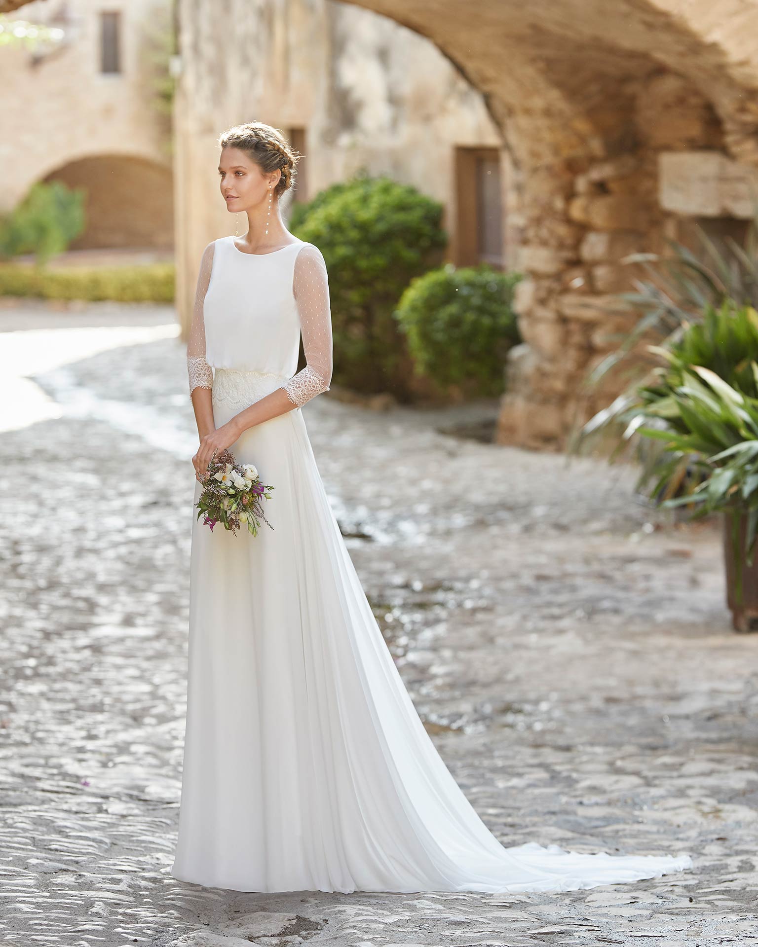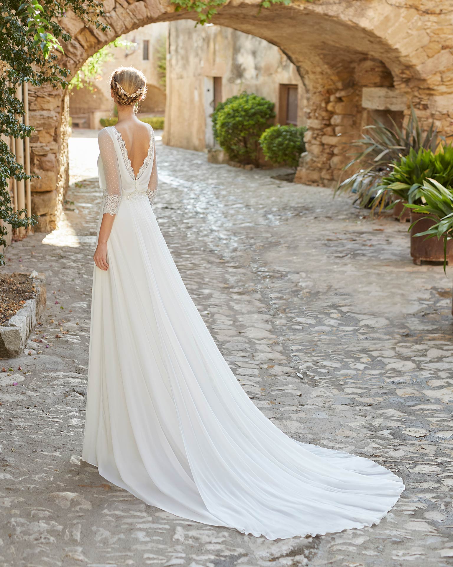 Vestido de noiva boho chic em estilo princesa, confeccionado em georgette, com cauda removível. O modelo apresenta decote bateau, costas em V com acabamento em renda e mangas três quartos, criando um visual elegante, romântico e com toque boêmio. Uma criação Alma Novia que combina charme, sofisticação e versatilidade.