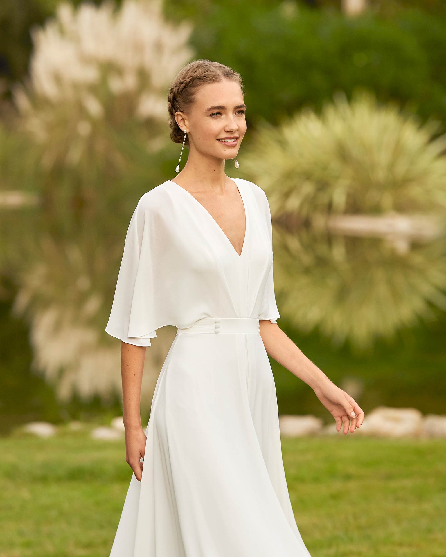 Vestido de noiva elegante em estilo sheath, confeccionado em crespon com sobreposição fluida. O modelo apresenta decote em V, costas em gota com detalhes em botões de pérola e mangas esvoaçantes, criando um visual sofisticado, delicado e cheio de charme. Uma criação exclusiva Alma Novia que combina elegância e movimento.