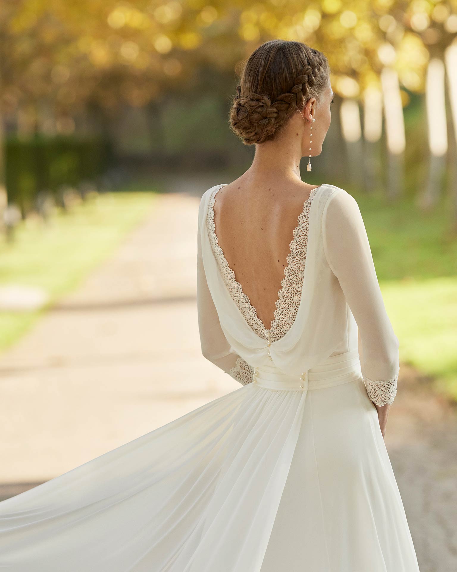 Vestido de noiva clássico em linha A, confeccionado em georgette com cauda removível. O modelo apresenta decote bateau, costas abertas com detalhes em renda e mangas estilo francesas, além de aplicações bordadas em renda e pedrarias na cintura, criando um visual elegante, sofisticado e romântico. Uma criação exclusiva Alma Novia que combina charme e delicadeza.