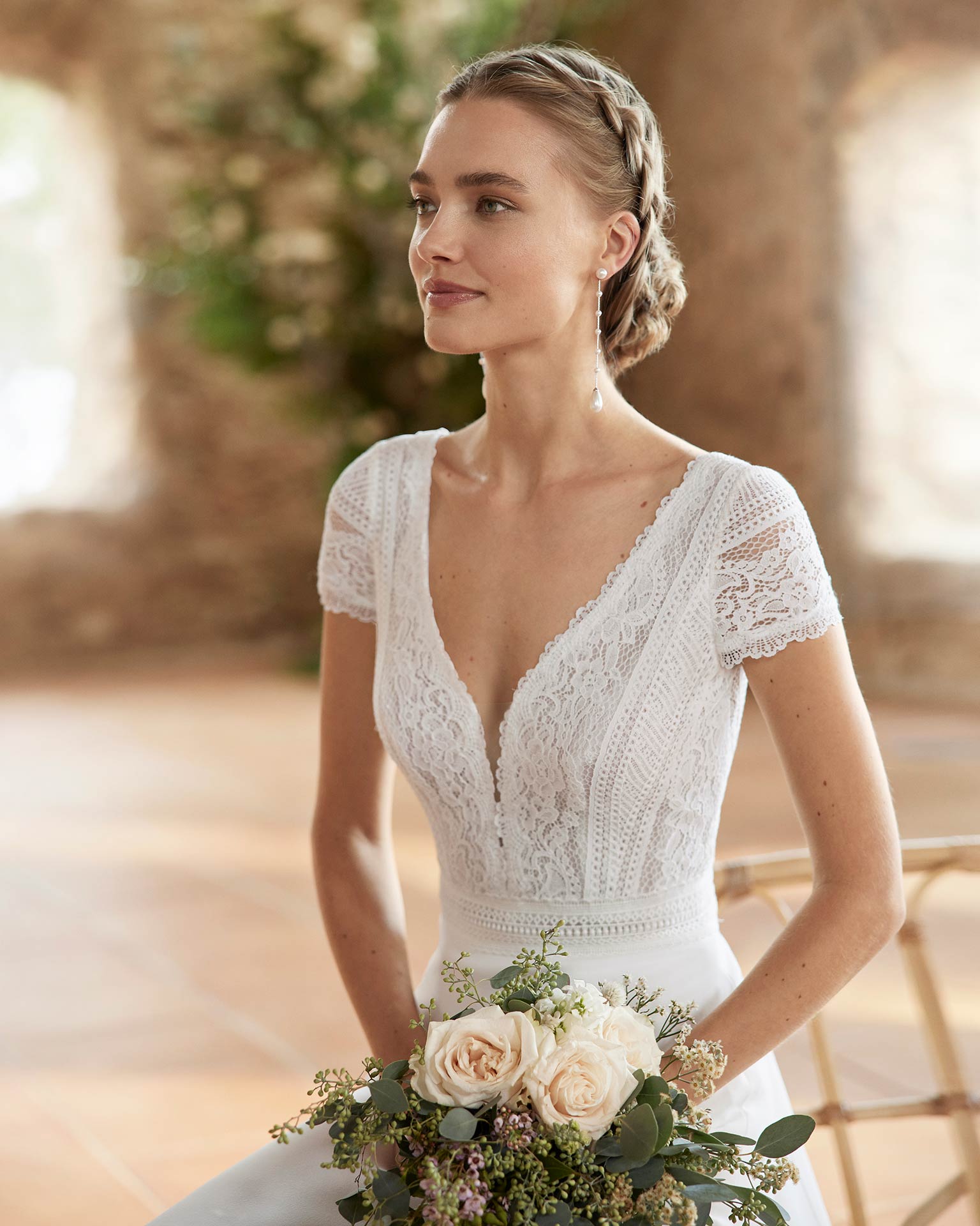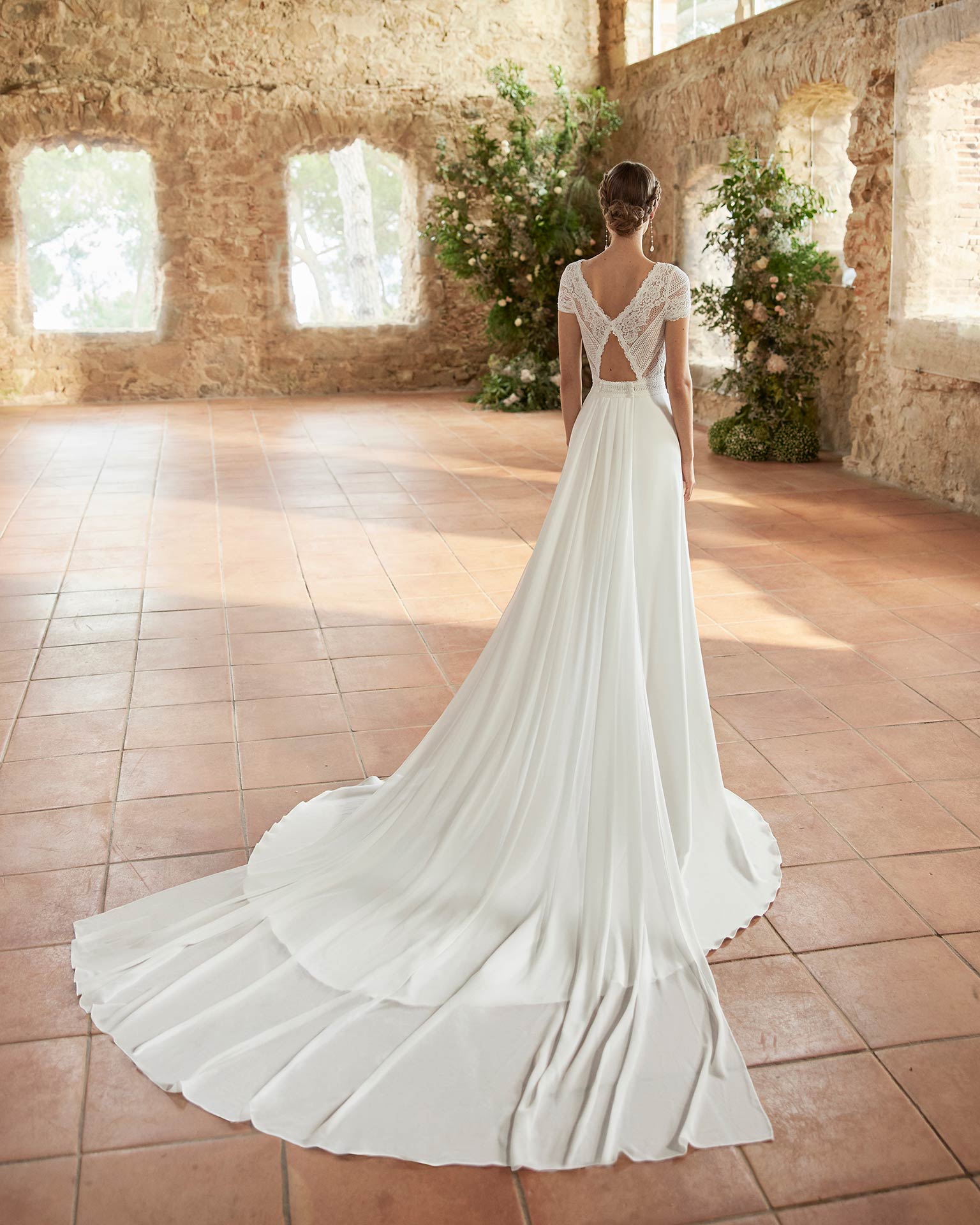 Vestido de noiva romântico em estilo princesa, confeccionado em crepe com cauda removível. O modelo apresenta decote profundo, costas abertas e mangas curtas em renda, criando um visual elegante, delicado e cheio de charme. Uma criação exclusiva Alma Novia em georgette combinada com renda, que une sofisticação e romantismo.