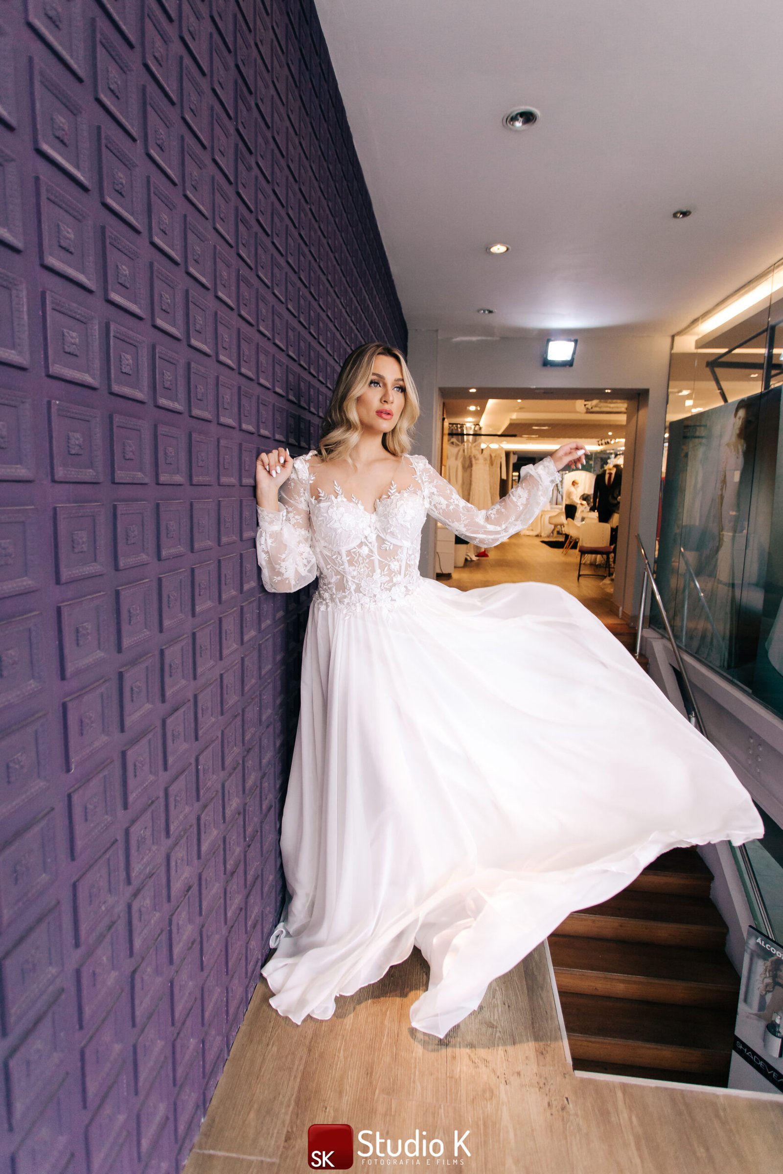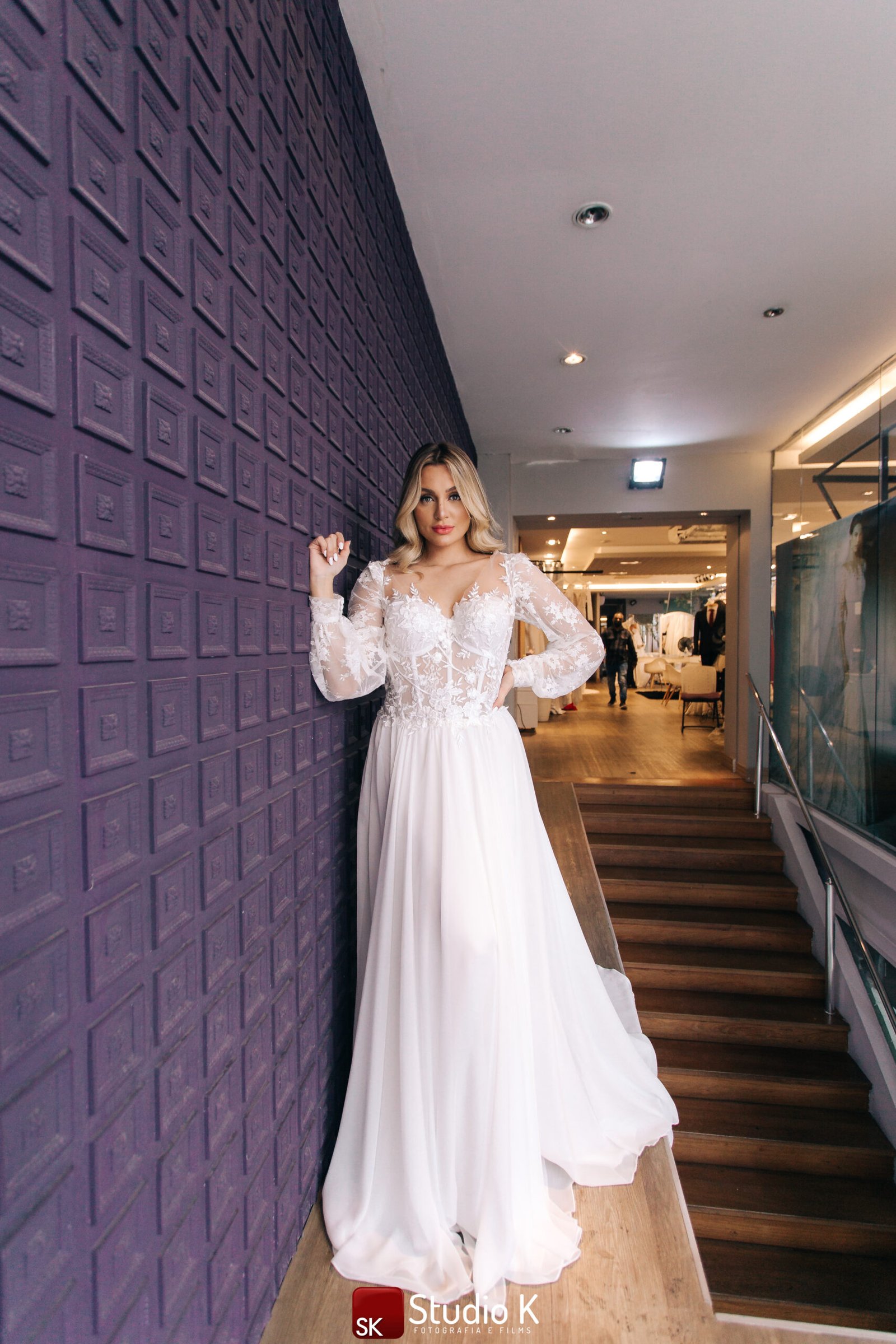 Éos, A deusa do Sol Responsável também pelo brilho do Sol e das tonalidades do Céu, Eos é a deusa que desperta as pessoas e criaturas dos mais profundos sonhos e derrama orvalho nas folhas, sendo mais conhecida por ser a deusa especialmente do amanhecer. Normalmente citada como de longos cabelos louros. Ágil e graciosa, é munida de asas nos ombros e nos pés. Vestido de noiva com o ápice de elegância e leveza. Um leve decote princesa com transparência no corpo, confeccionado em renda chantilly e com aplicações em renda fio de seda. Suas longas mangas dão um claro toque de romantismo, com uma saia ampla no corte godê em tecido fino de musseline, fazendo desse modelo um vestido sublime e ideal para noiva realçar sua elegância, conforto e beleza